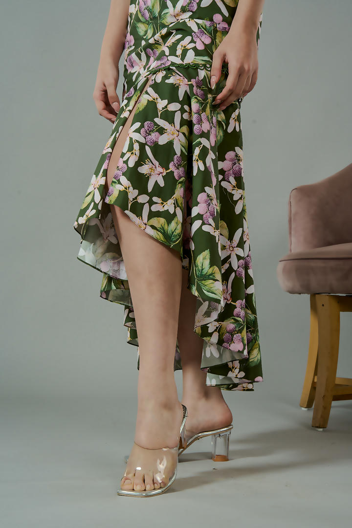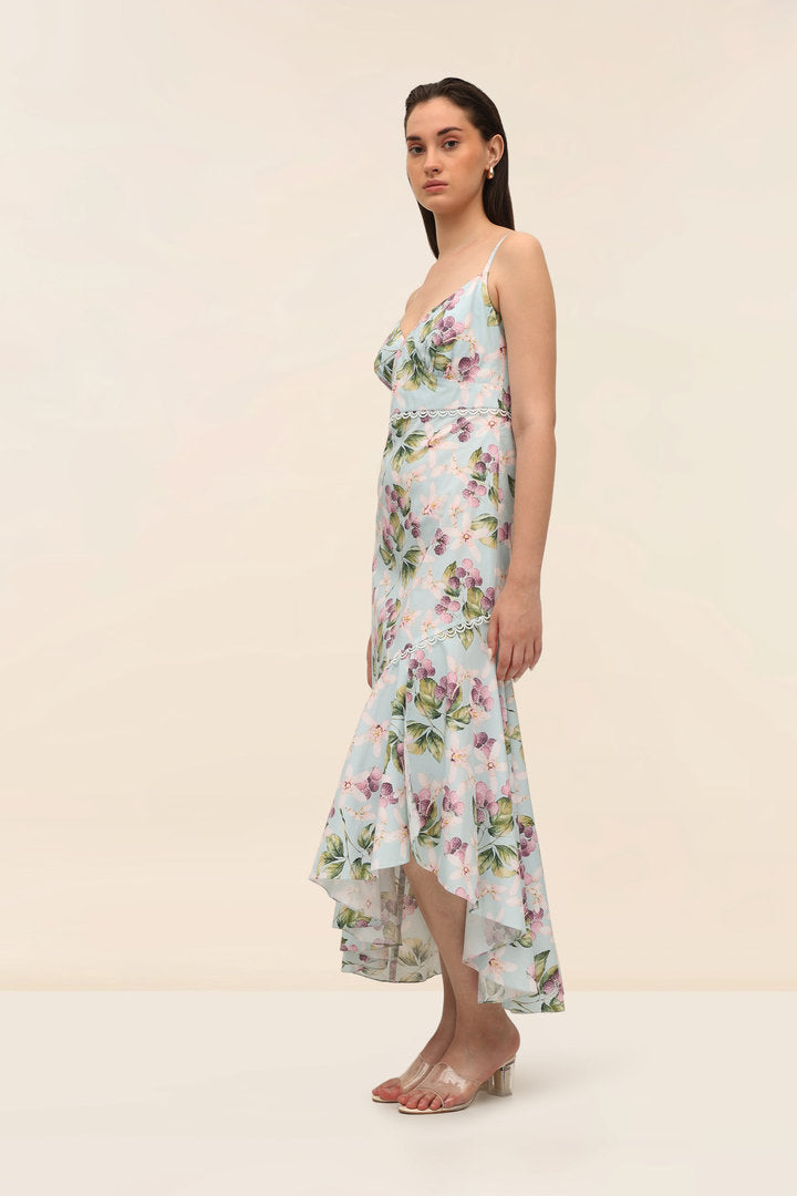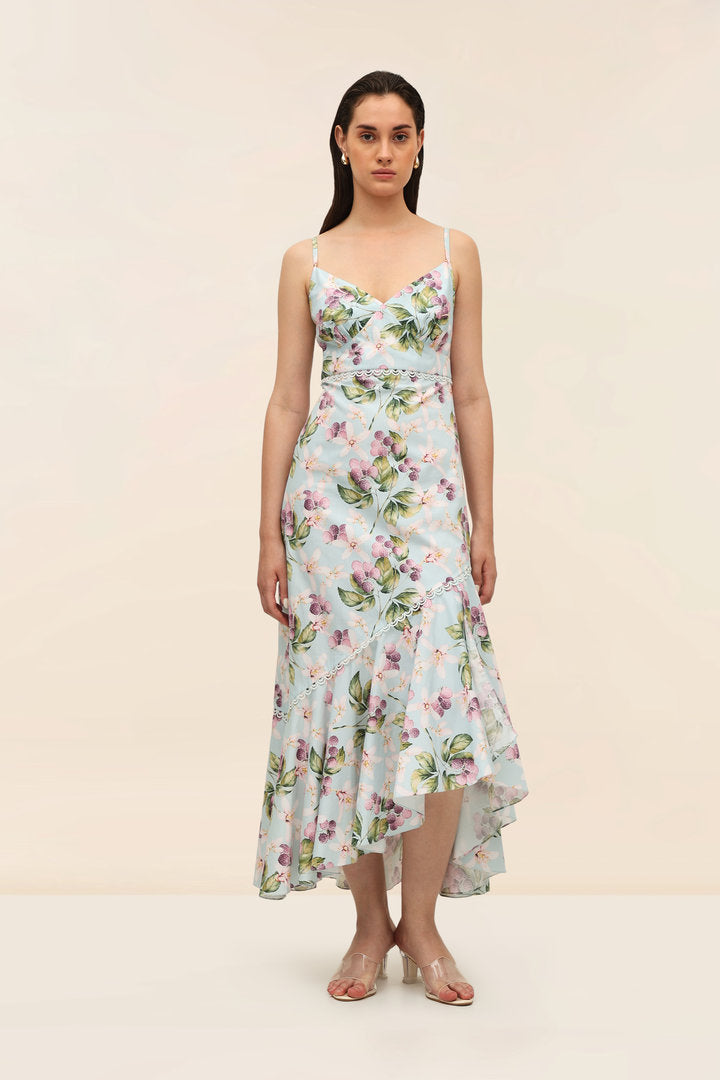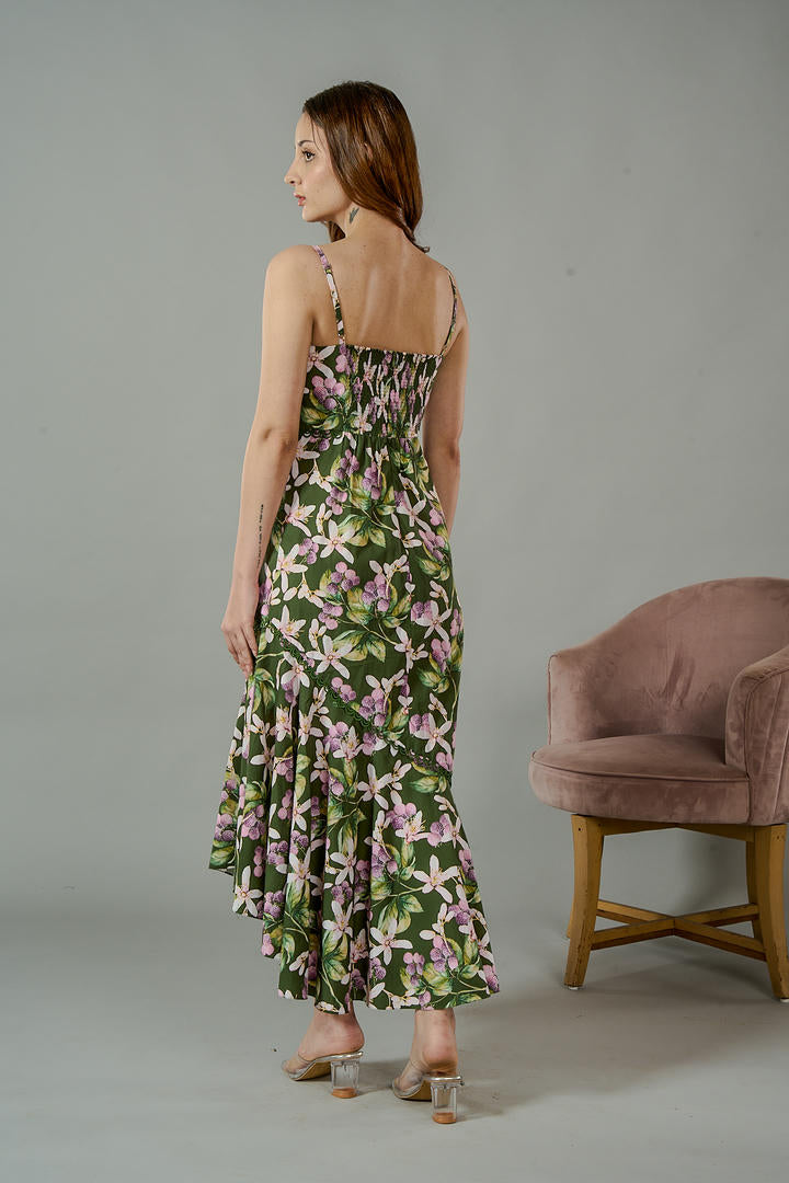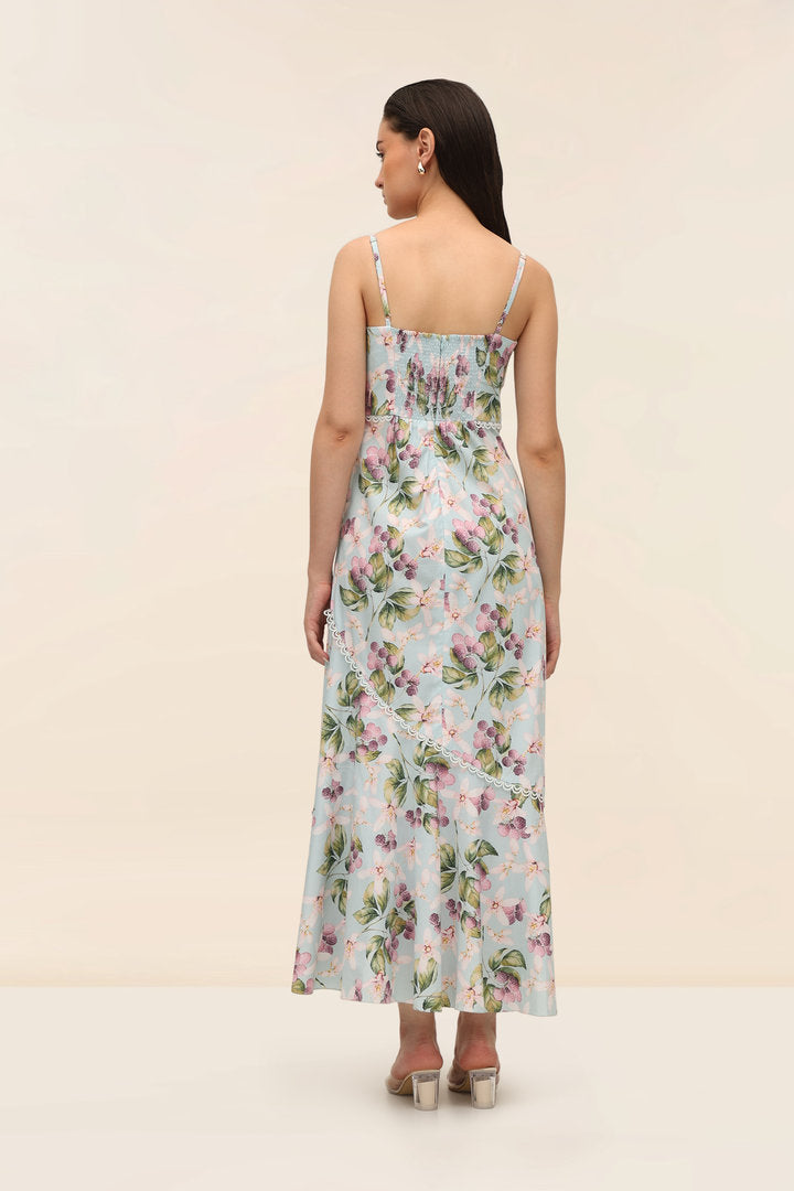 The Esta Midi Dress is a midi dress with lace trim, slender straps, a smocked back, and a side slit for ease. Available in dark green and sky blue, it blends comfort and elegance for any occasion.