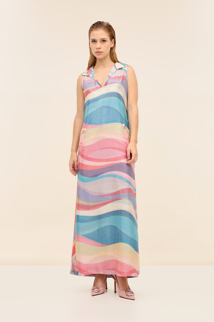 The Sirena Hoodie Dress is made from sequins georgette for a soft shimmer and relaxed drape. Featuring a V-neckline, side slits, and an attached hood at the back, it’s an effortless piece that slips easily from beach days to city strolls.