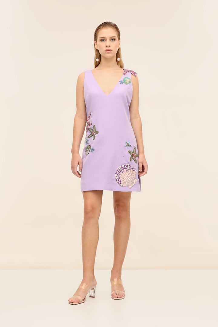 The Elva Mini Dress is a sleek shift silhouette in banana crepe, designed with a flattering V-neckline and wide shoulder straps. Hand-beaded sea-inspired motifs bring texture and whimsy, making this polished mini a standout for seaside dinners and resort nights.