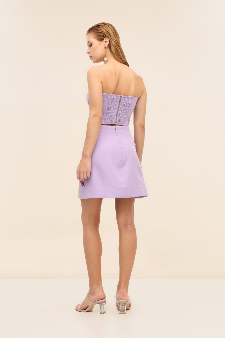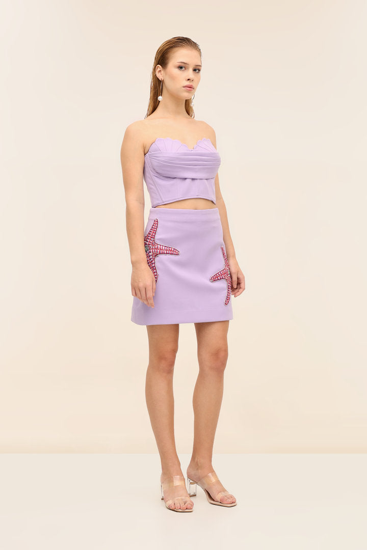 The Mira Mini Skirt is a straight-cut silhouette in banana crepe, detailed with hand-embellished starfish motifs on each hip. Clean lines meet playful texture — a standout mini that brings a little sparkle to your summer rotation.
