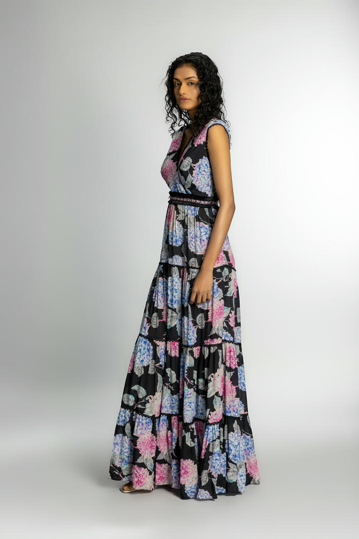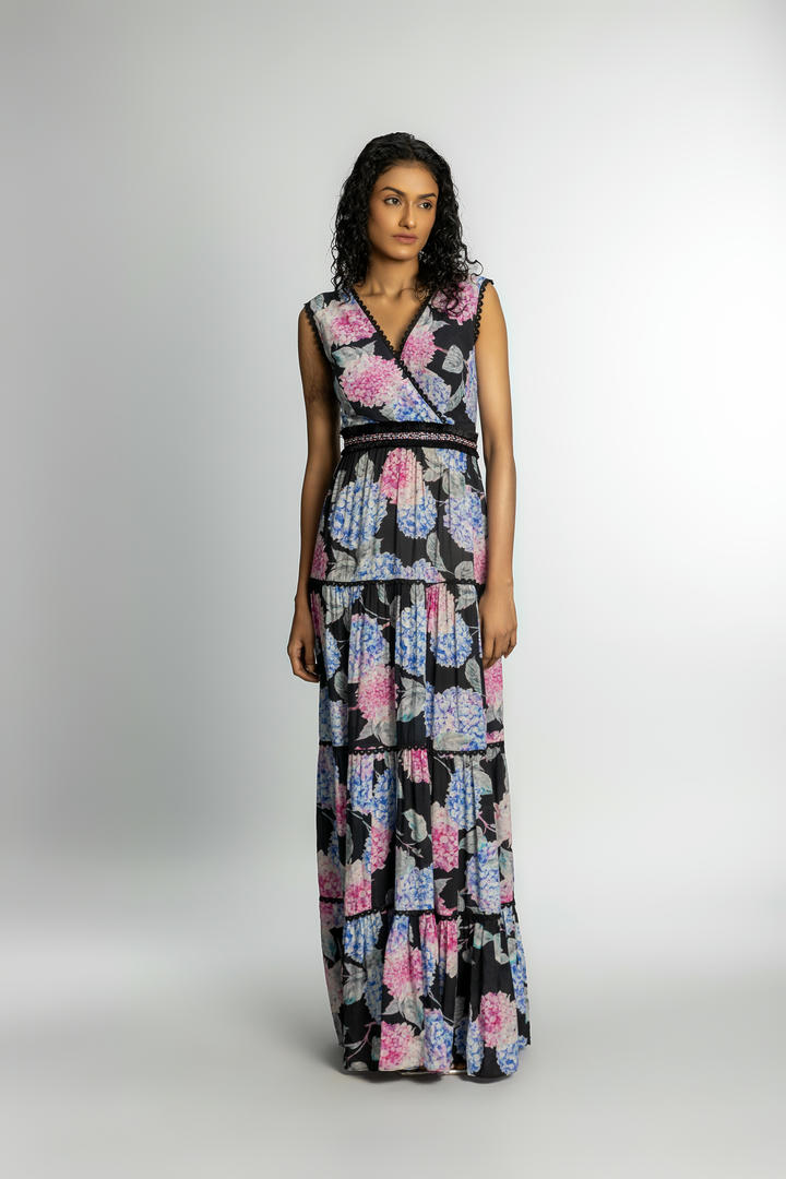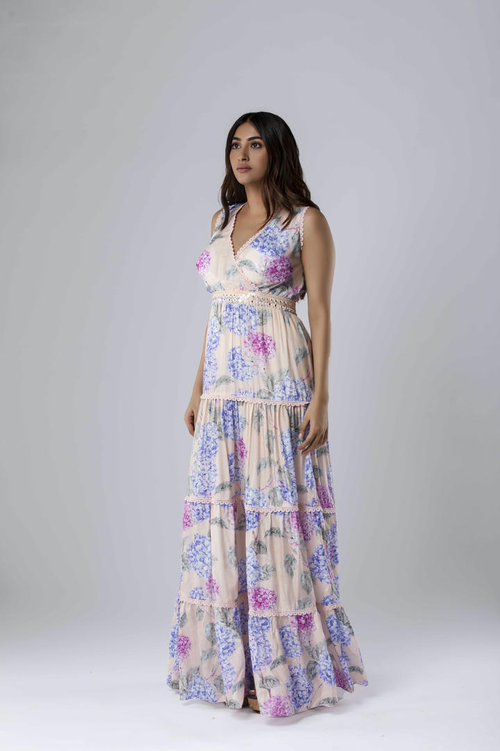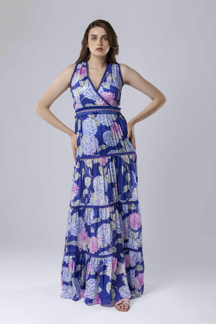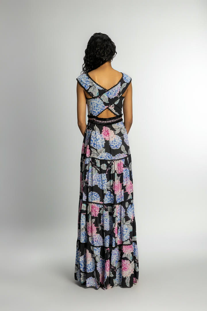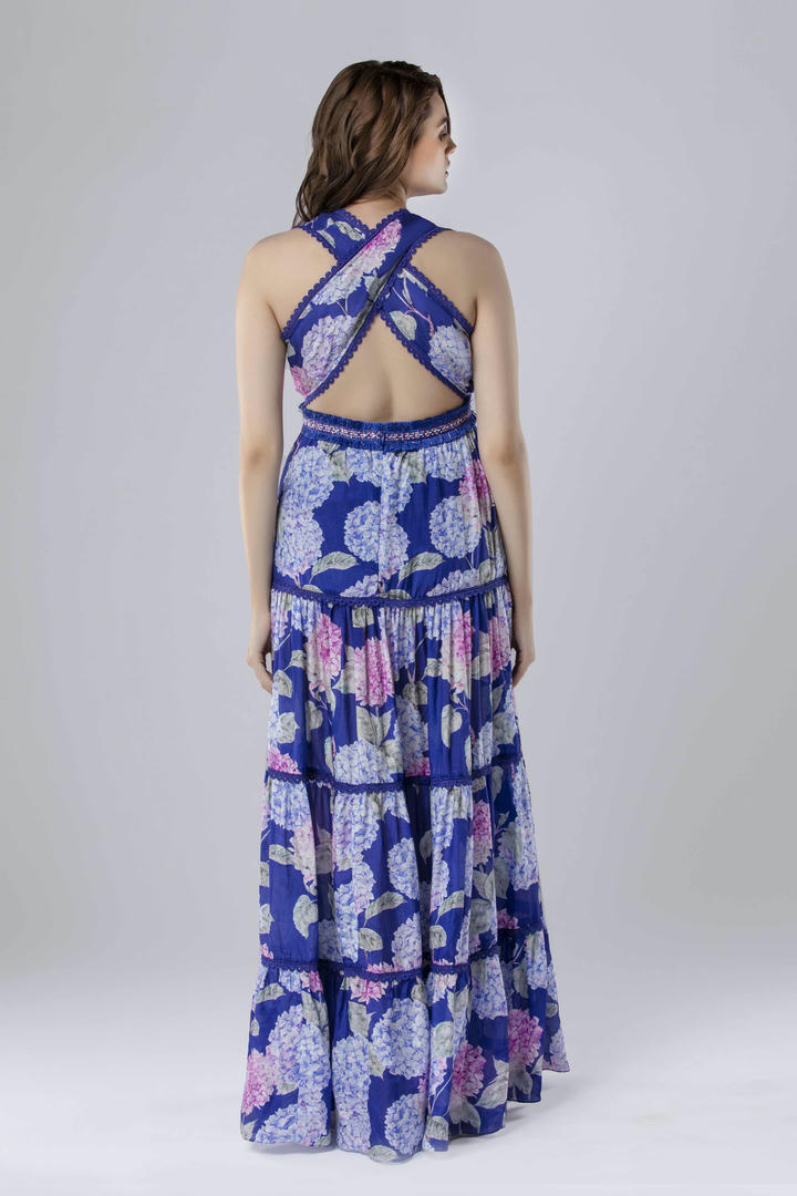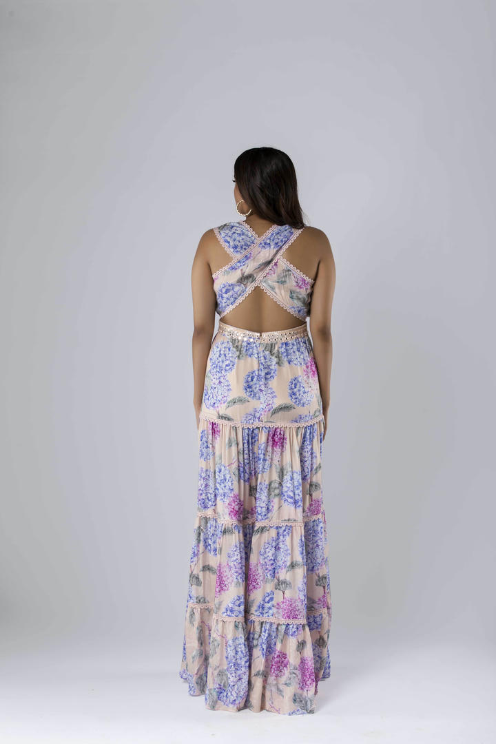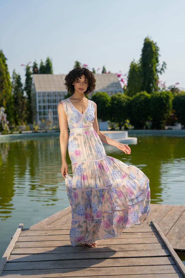 The Kiri Criss-Cross Dress is a tiered maxi featuring a criss-cross neckline that continues to the back, with embroidered waist detailing and lace accents. A refined silhouette made for celebrations, from garden gatherings to evening dinners.
