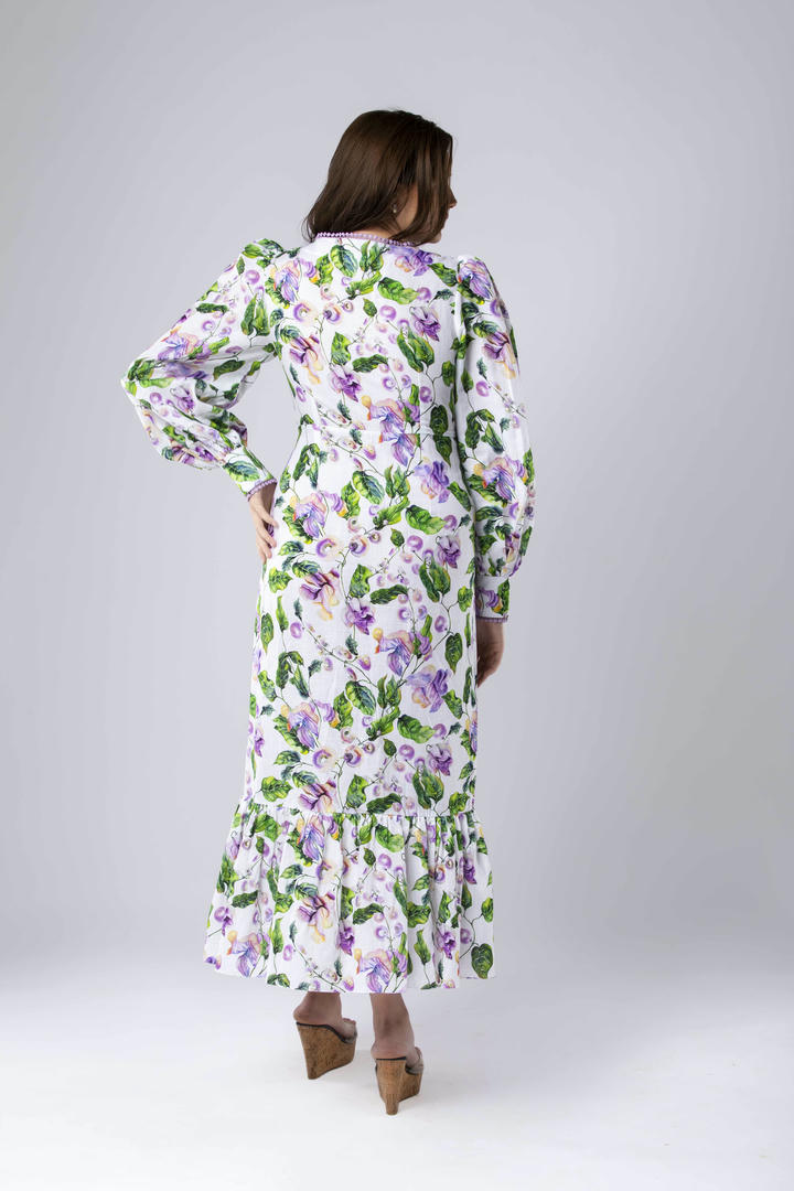 The Lola Long Sleeve Dress features a button-up V-neckline, full balloon sleeves with cuffed hems, and delicate crochet lace detailing. Finished with a gathered hem and side zip for comfort, all in a soft floral print.