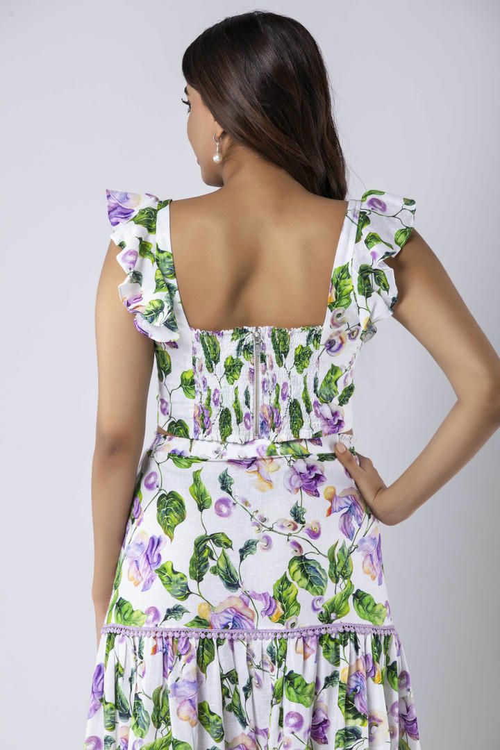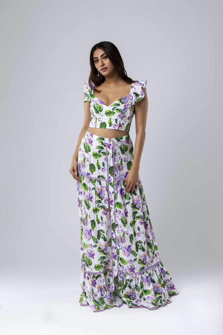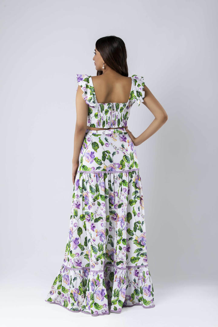 The Cala Crop Top features a sweetheart neckline with ruffle-trimmed straps and a structured fit. Made in a bold floral print, it's a fresh, flattering top that pairs perfectly with the matching skirt.