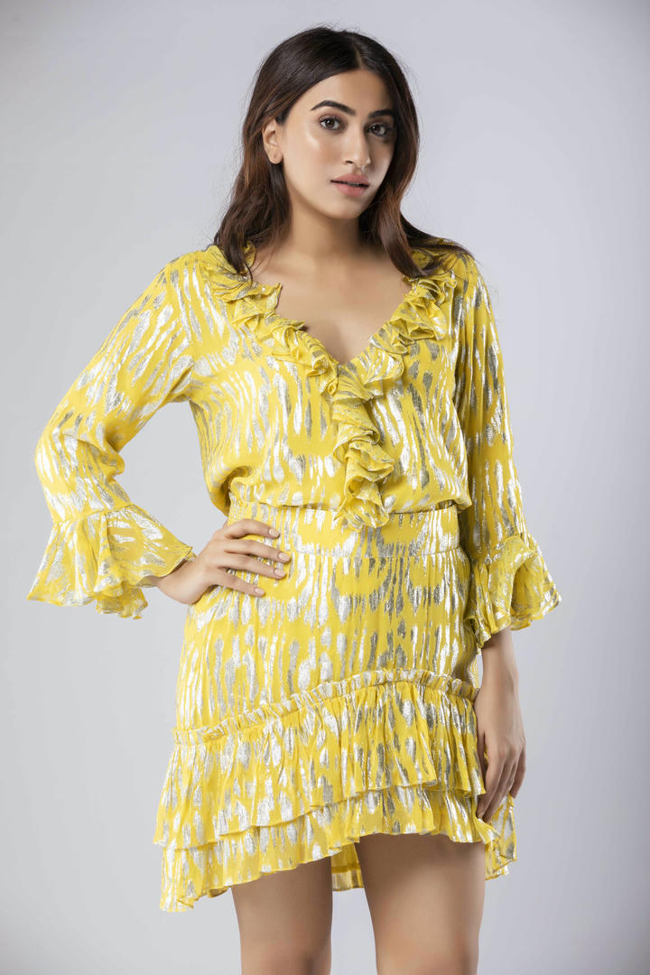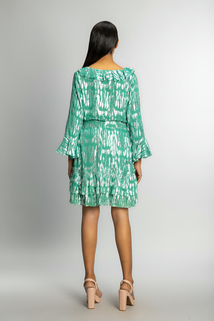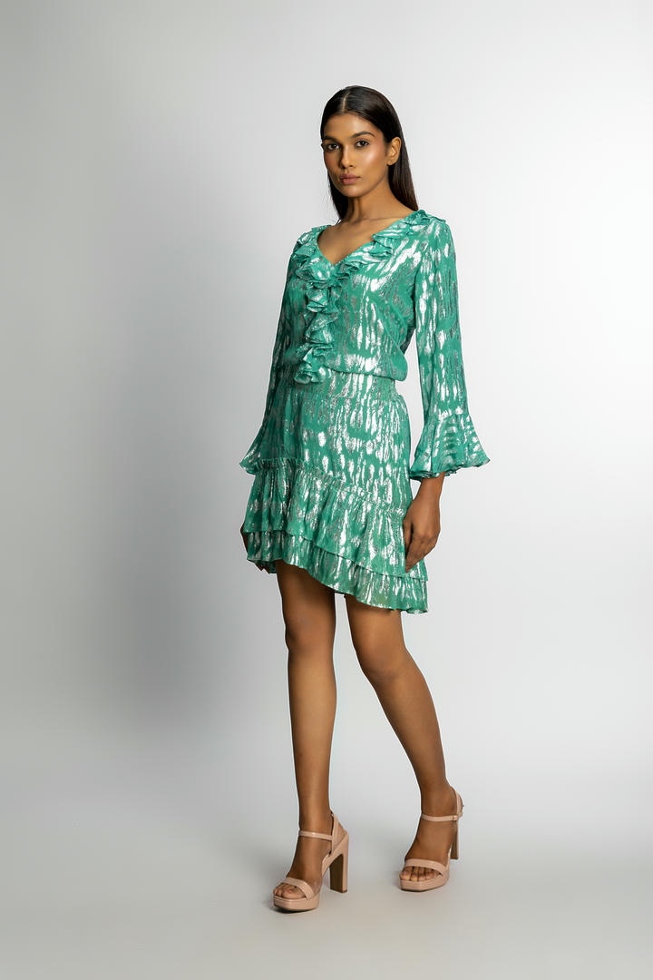 The Lumae Ruffled Top features a V-neckline with layered ruffle detailing, flared sleeves, and a relaxed fit in shimmering fabric. Designed to pair with the matching skirt or style on its own.