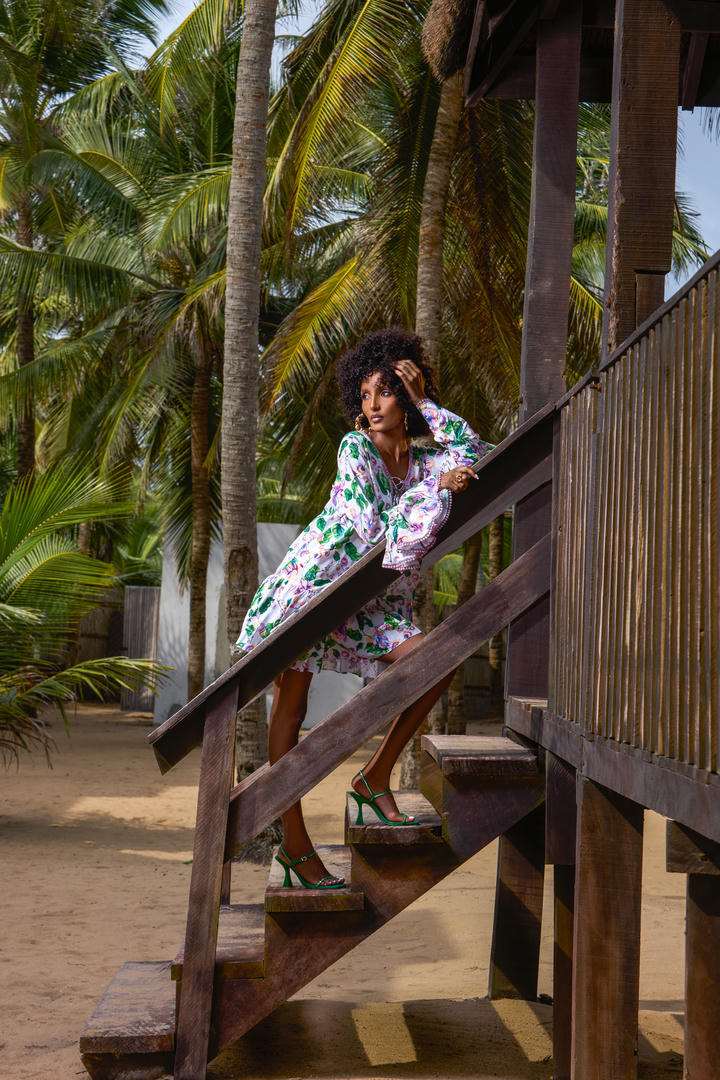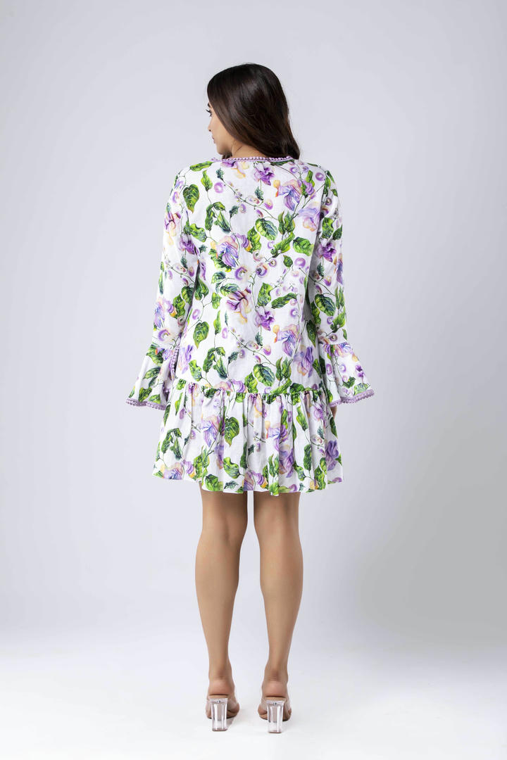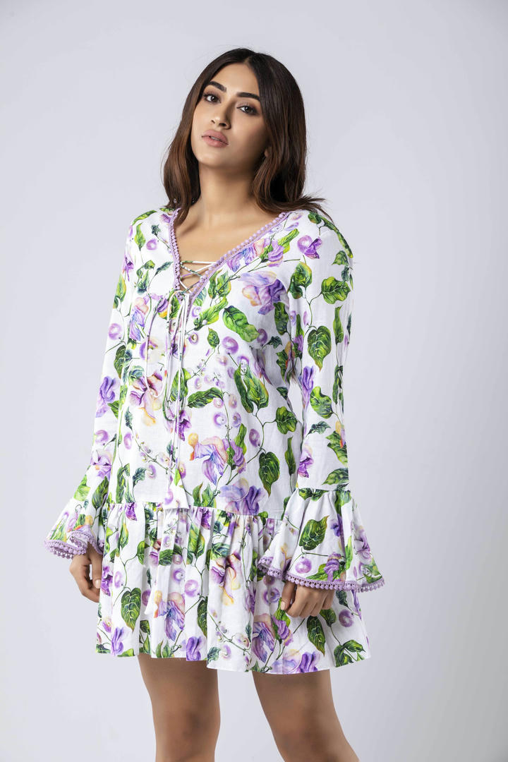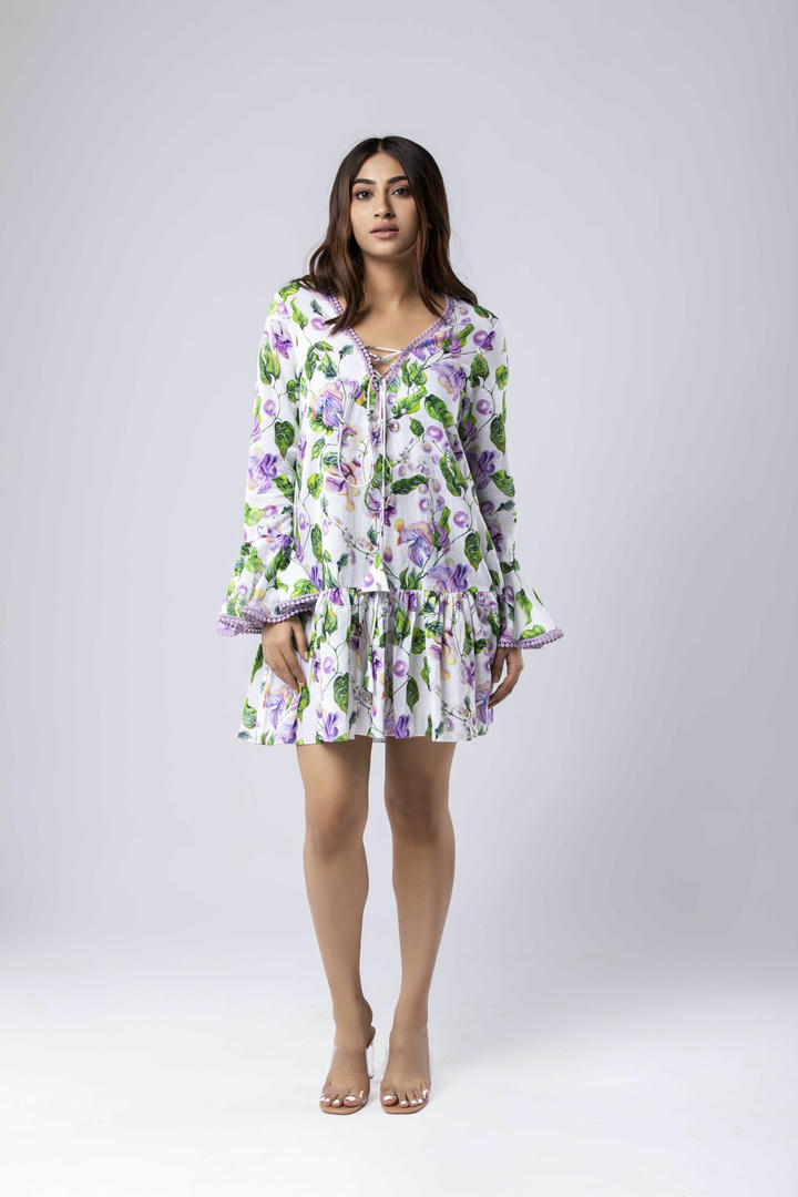 The Myra Mini Dress features a criss-cross tie-up neckline, flounce bell sleeves, and crochet lace detailing at the neck and cuffs. A gathered hem adds movement to this playful, flattering silhouette.
