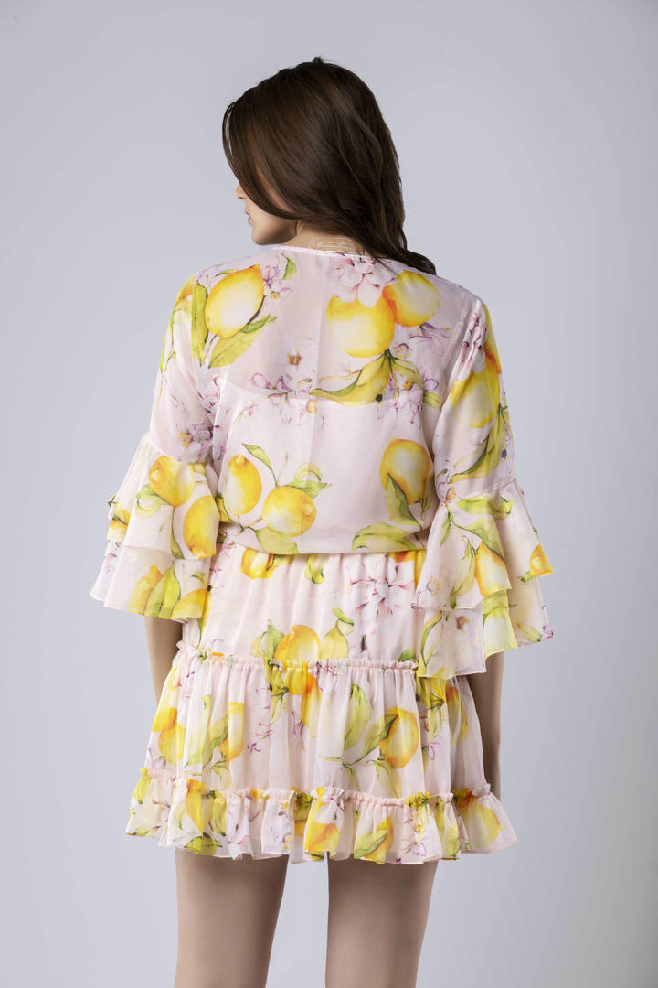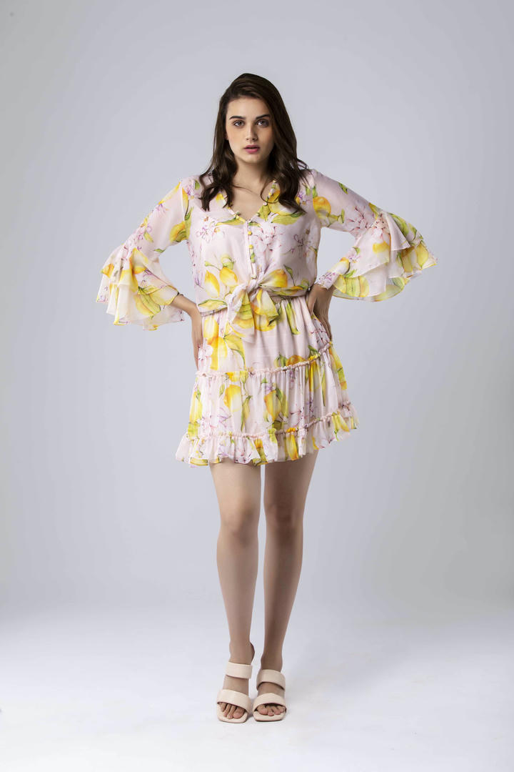 The Liv Button-Up Top features a V-neckline, ruffle-trimmed sleeves, and a relaxed fit, layered over a separate crepe slip for added comfort. Designed in a vibrant print, it’s an easy-to-style piece with standout detail.