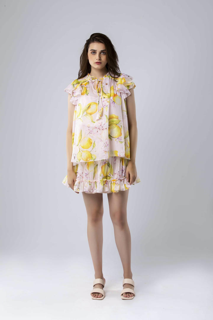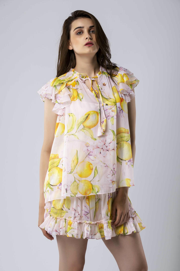 The Tess Swing Top features smocked shoulders and double-layered ruffle sleeves for soft structure and movement. Styled with a crepe slip, it's available in black and peach—ideal for layering or wearing solo from day to night.