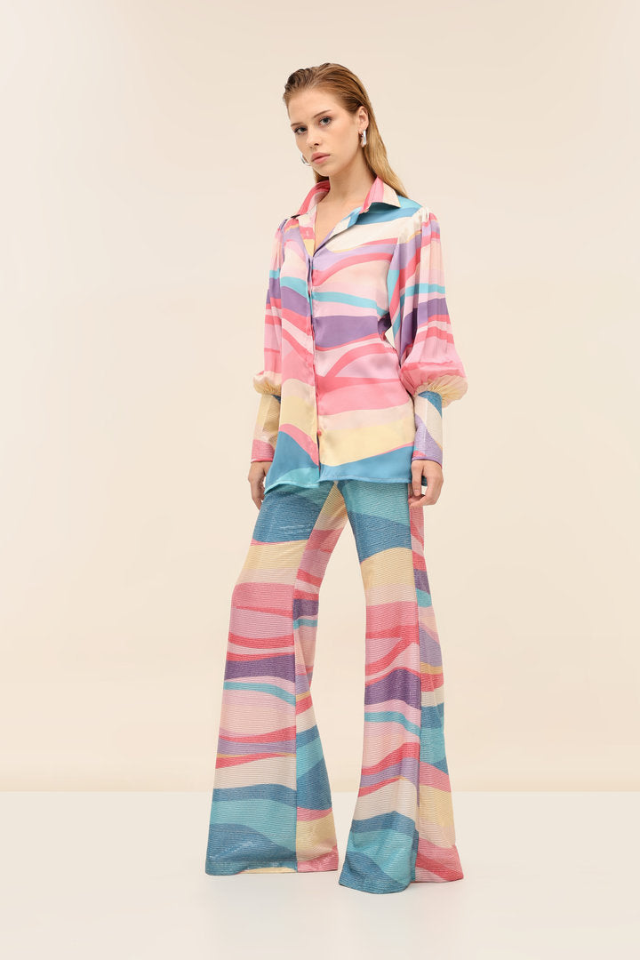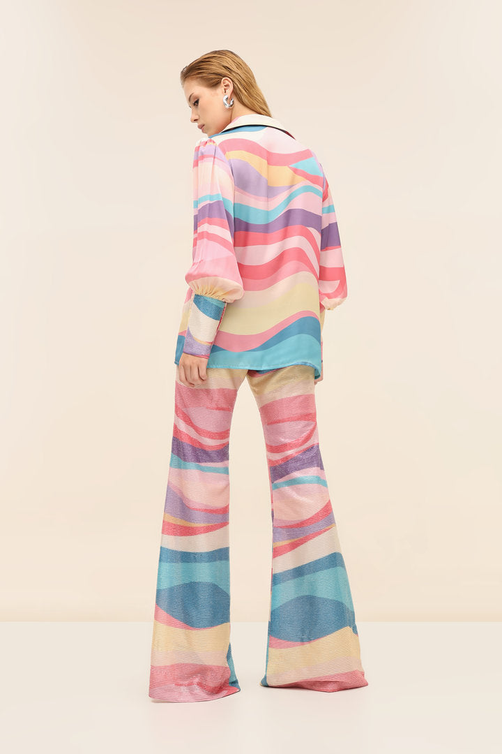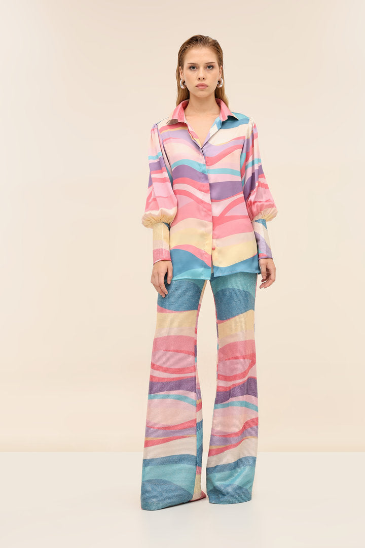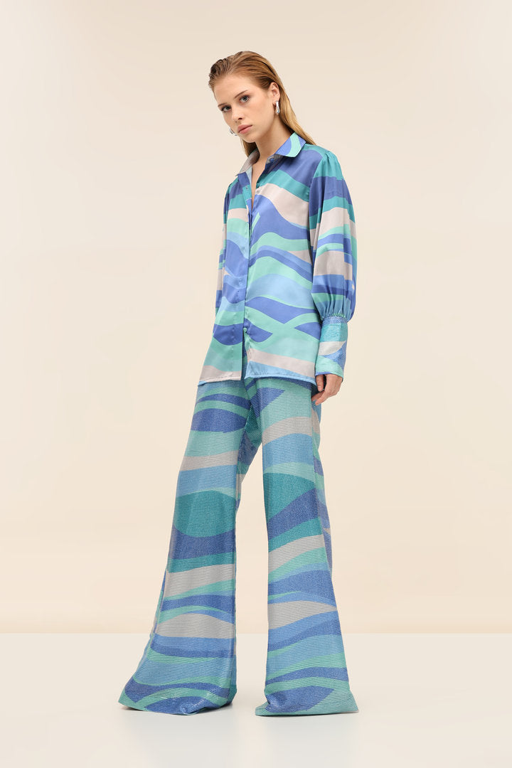 The Aqua Shirt comes in both Sea Foam Blue and Skye. Designed in satin with sequins georgette cuffs, it’s an elevated essential — wear it tucked, tied, or loose over swim.