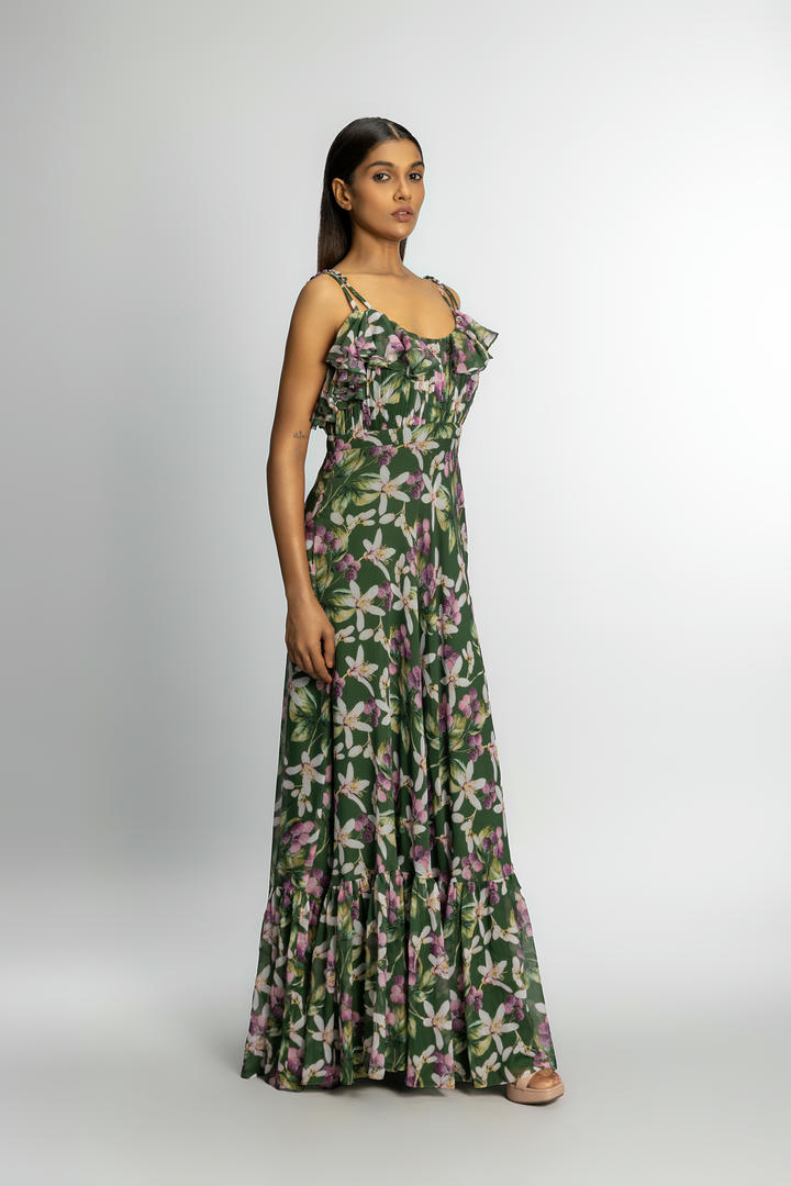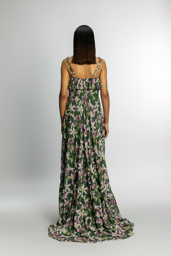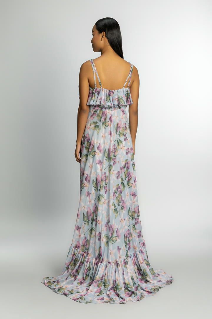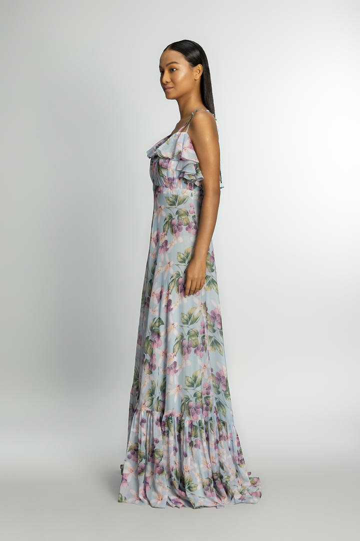 The Nerima High-Low Dress is a chiffon silhouette with adjustable straps, soft ruffles, a smocked back, and a discreet side zip. Available in sky blue and dark green, it’s finished in a delicate cherry blossom print for an airy feel.