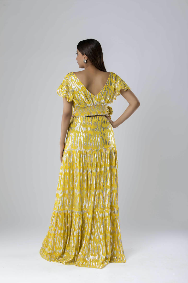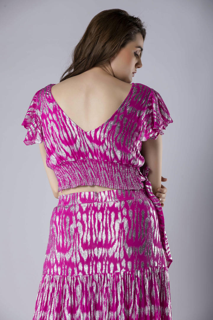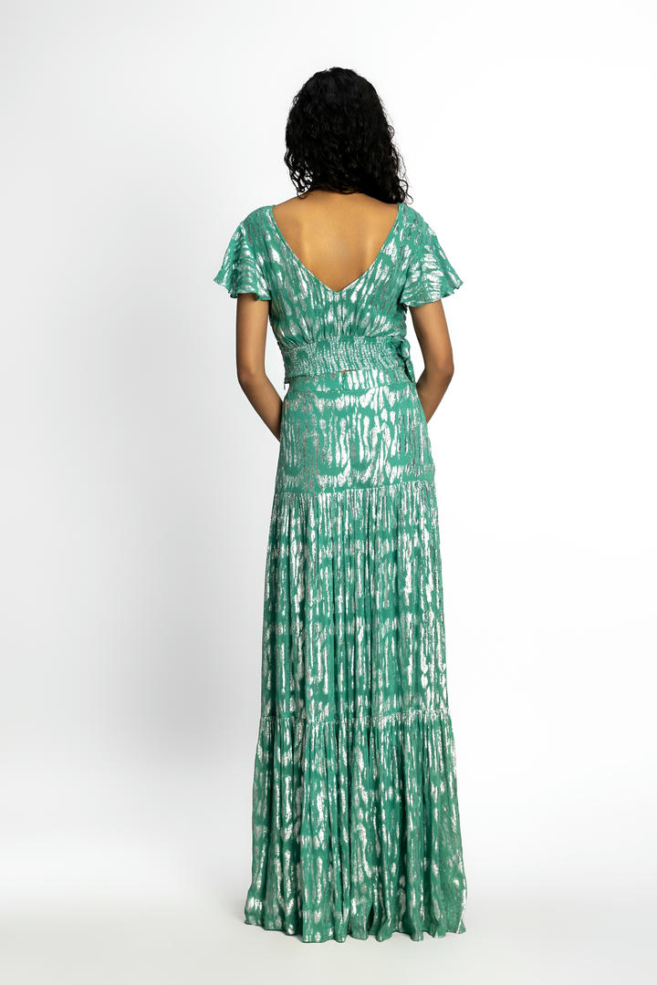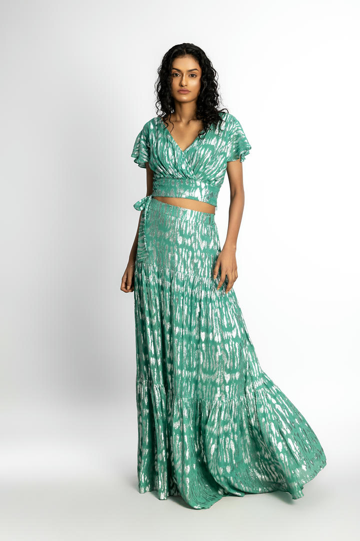 The Nova Tiered Skirt is a two-layered A-line silhouette in shimmering fabric, designed with side smocking at the waistband and a concealed back zip. Flowy and sculptural, it completes the co-ord set with the Mira V-Neck Crop Top.