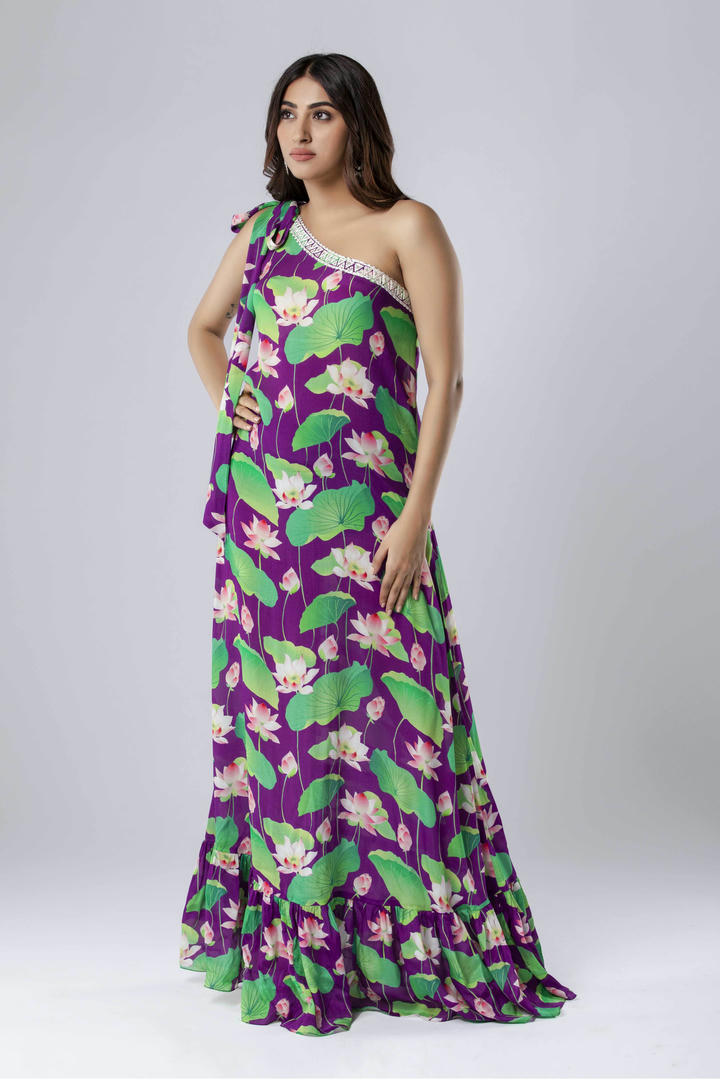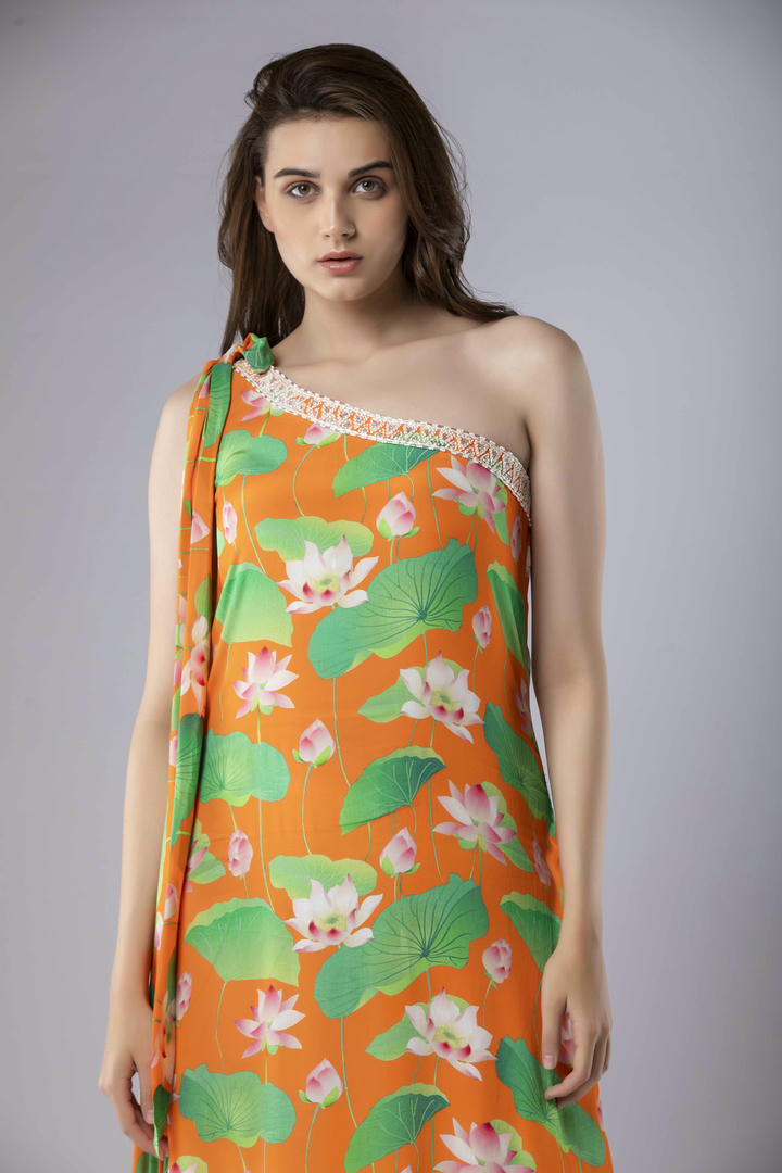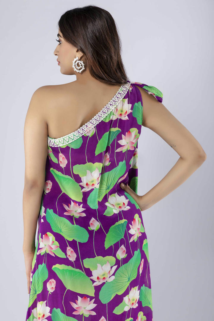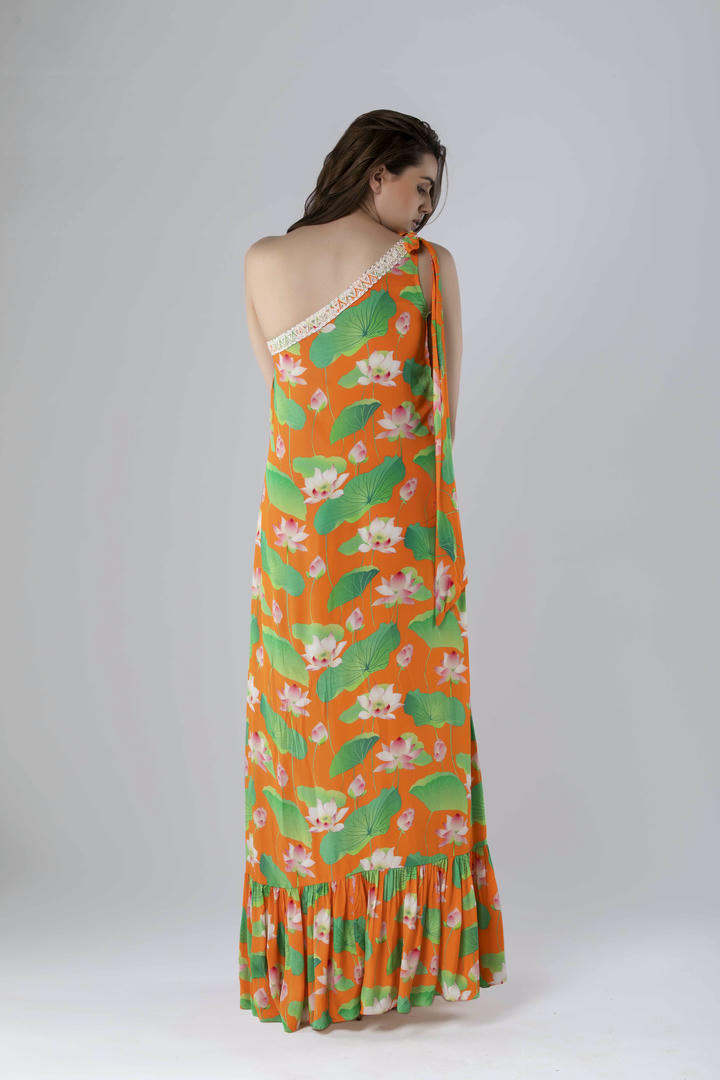 The Sia One Shoulder Dress is a maxi silhouette featuring an embroidered neckline and a tie-up detail at one shoulder. Flowy and refined, it’s an effortless choice for special occasions or destination events
