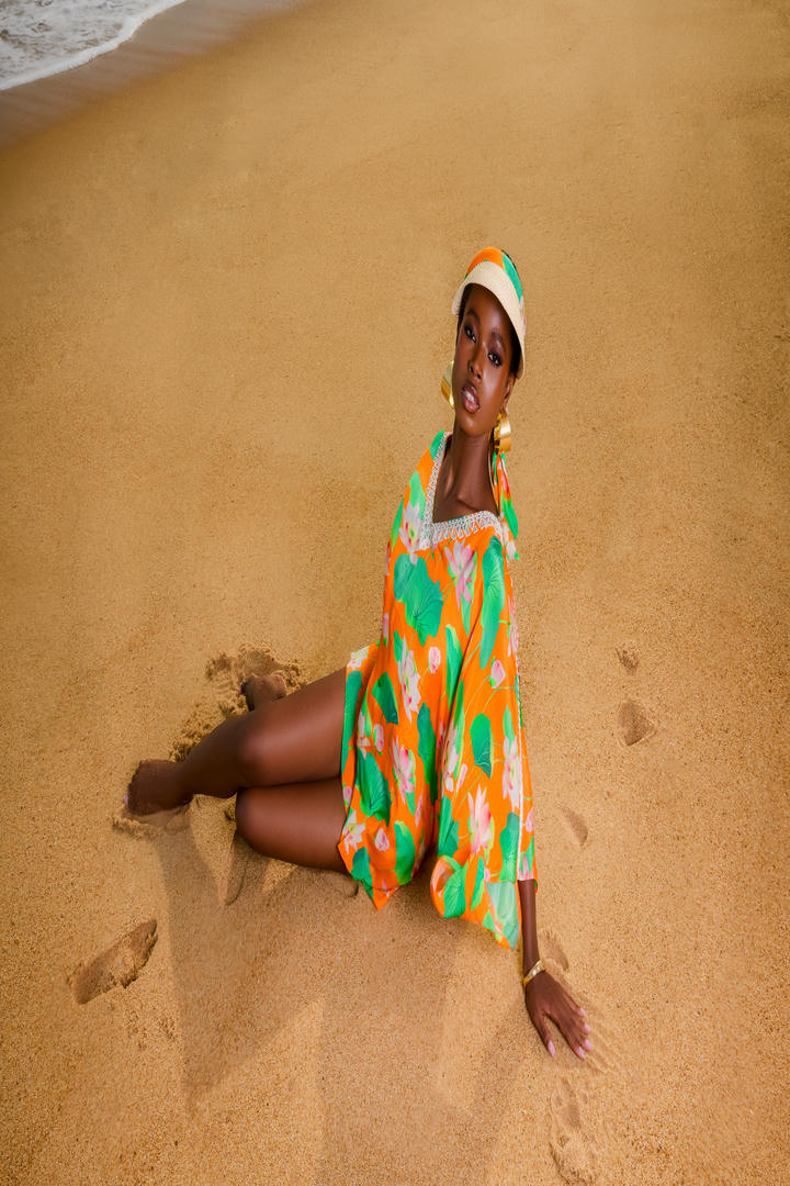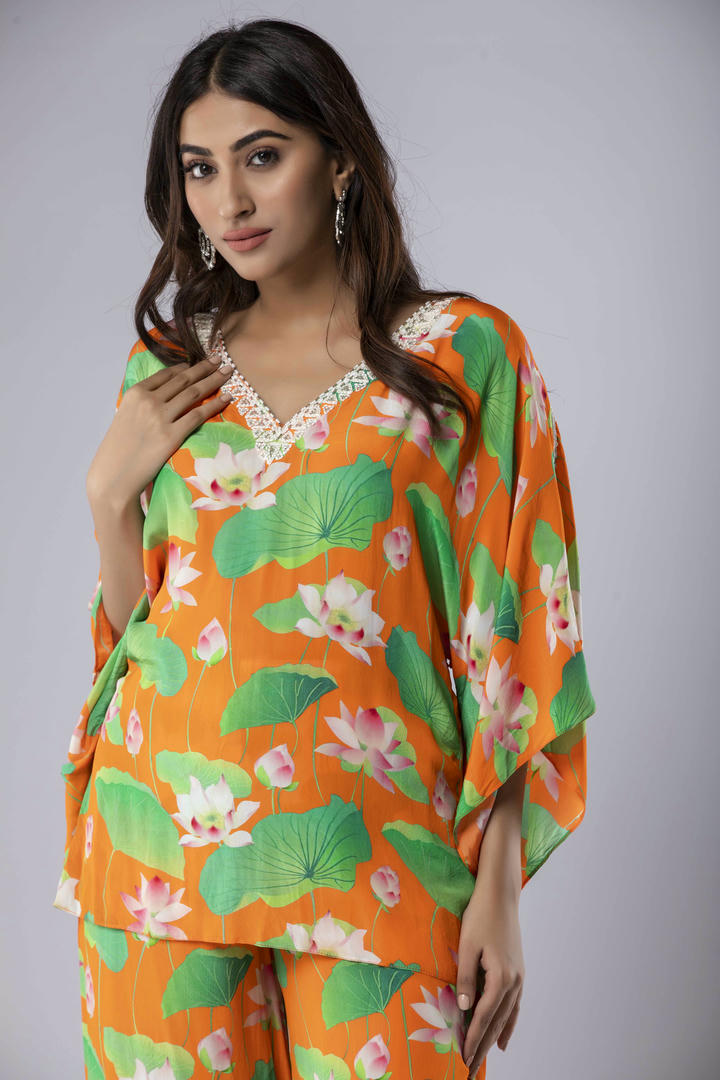 The Vala Tunic Top is a printed crepe top with a relaxed fit, featuring an embroidered V-neckline and flared sleeve hems. Easy and versatile, it's available in orange and purple.